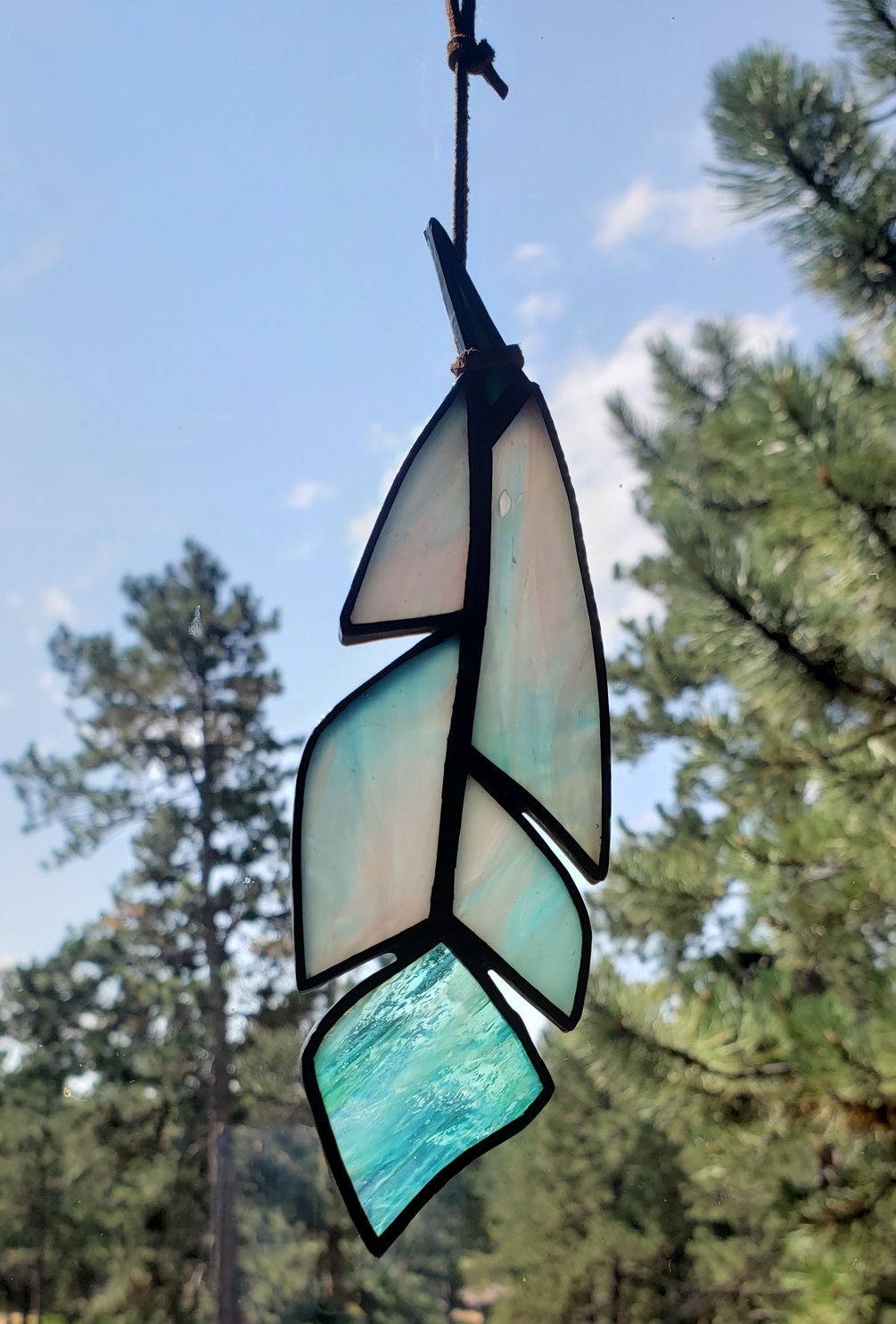 One of a kind pink/blue glass feather hand-made by Rachel. Main feather is a mix of pink and blue glass, with a transparent green-blue bottom. Length is approximately 6 inches. Comes with a suede cord, ready to be hung in a window and reflect the light.
