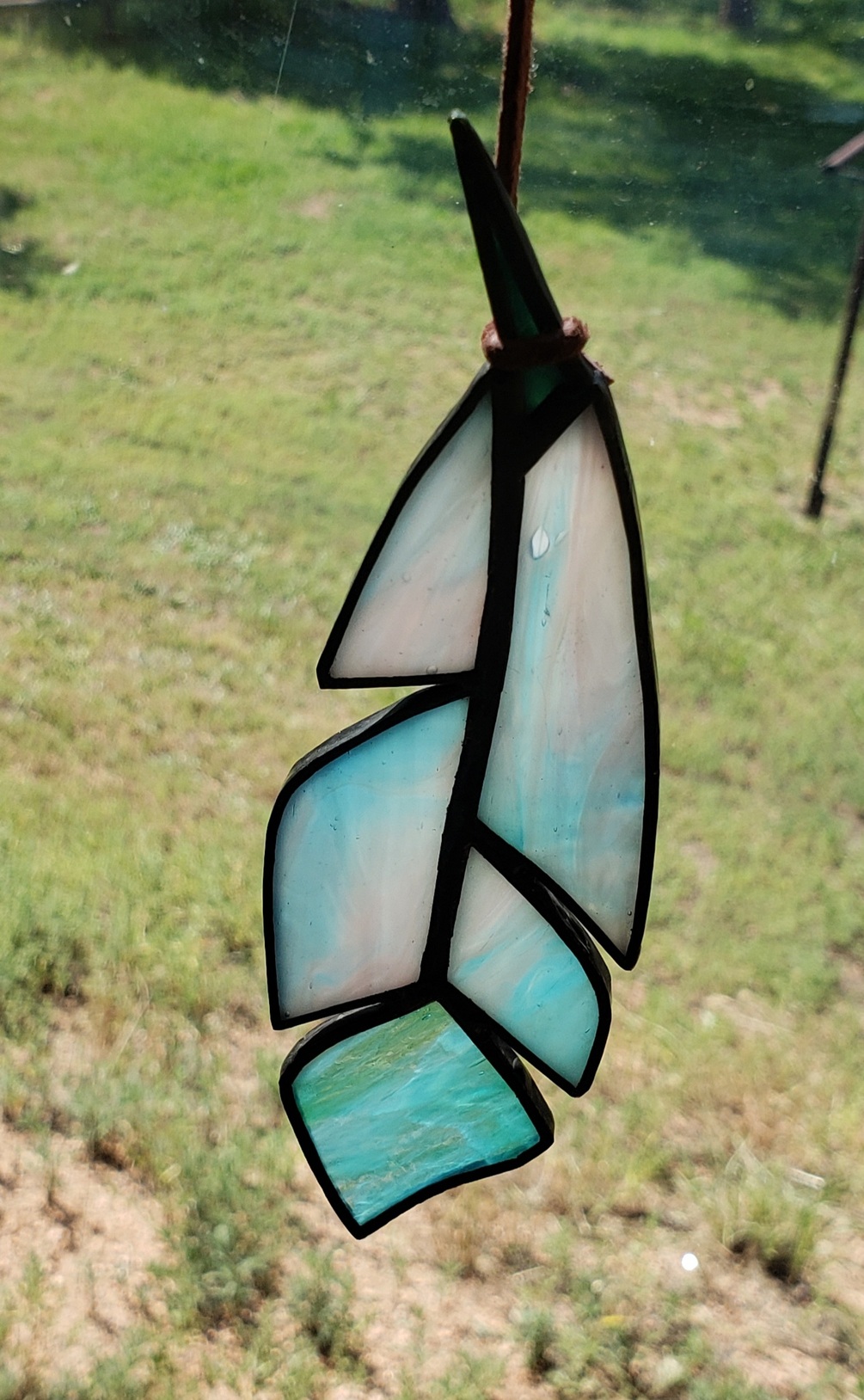 One of a kind pink/blue glass feather hand-made by Rachel.  Main feather is a mix of pink and blue glass, with a transparent green-blue bottom. Length is approximately 6 inches. Comes with a suede cord, ready to be hung in a window and reflect the light.