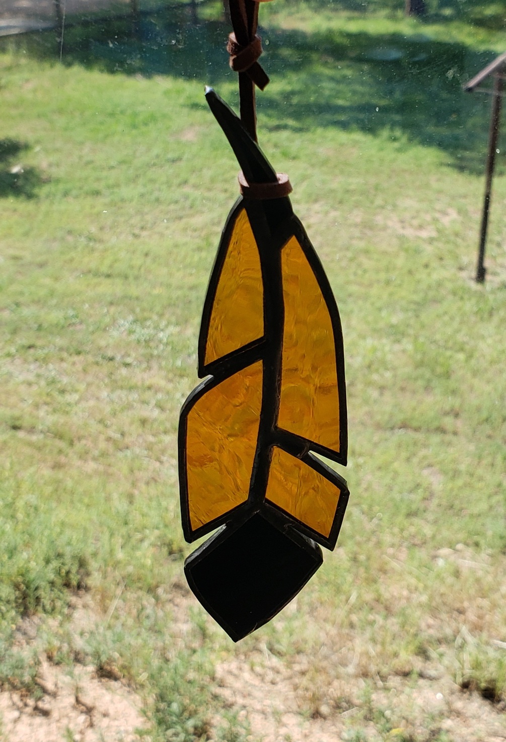 One of a kind orange glass feather hand-made by Rachel. Main feather is a clear orange, with a black stem and bottom. Length is approximately 6 inches. Comes with a suede cord, ready to be hung in a window and reflect the light.