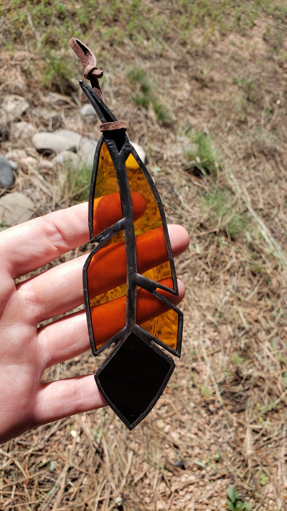 One of a kind orange glass feather hand-made by Rachel. Main feather is a clear orange, with a black stem and bottom. Length is approximately 6 inches. Comes with a suede cord, ready to be hung in a window and reflect the light.